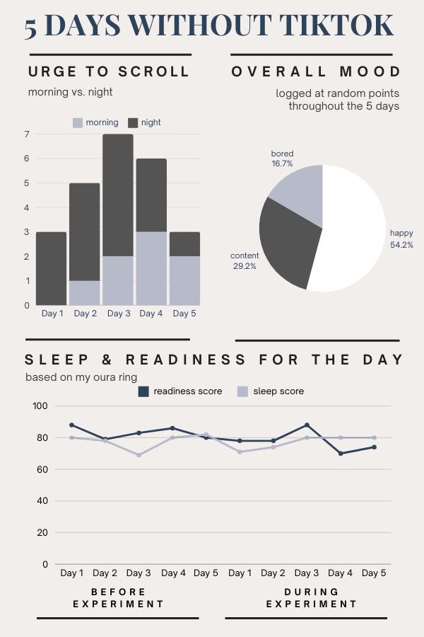 I collected data on my phone using my notes app, including how many times I had the urge to scroll. I love getting to the end of my day, lying down in bed, and knowing I can just scroll TikTok for as long as I want. The problem is that I will scroll for hours and hours when I should be sleeping. The dopamine-seeker in me doesn’t care about sleep even when the clock strikes 12 am, and I have to be up for 6.