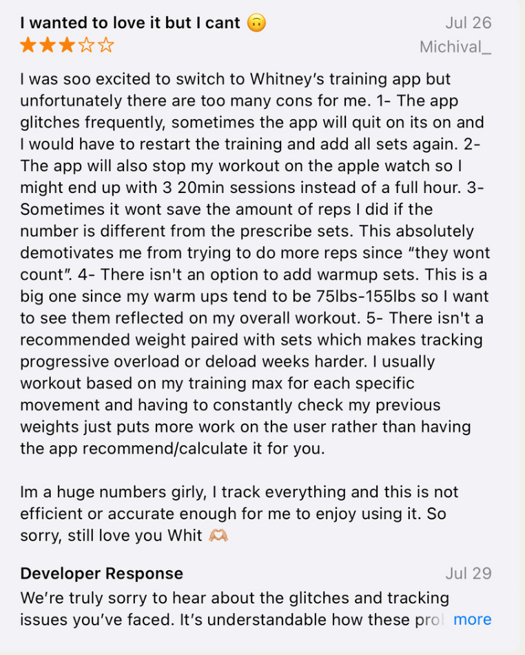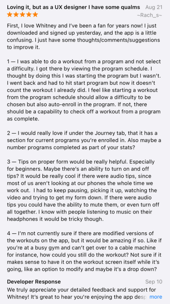 The app is rated 4.9/5 stars on the Apple App Store. It’s a workout app that provides different programs from ones at home to ones at the gym (all for different experience levels). Most users have had a positive experience, but there were also some that hadn’t. There were other users who provided helpful feedback and suggestions to improve the app itself. Here’s some of what they had to say: