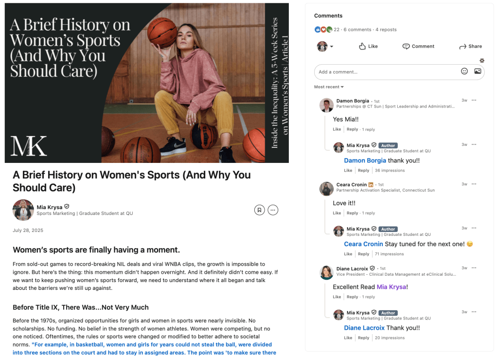 This project documented both the inequities facing women athletes and my growth as a content creator. By blending academic research, current events, and digital strategy, I created a series that reached thousands on LinkedIn, built my professional voice, and provided a framework for thought-leadership campaigns in sports marketing.